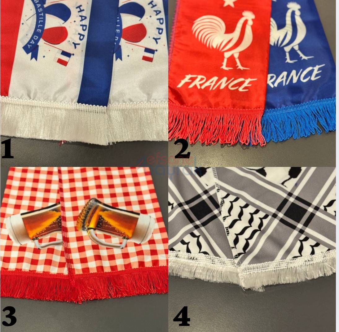 يتم إنتاجه من قماش الساتان أو الجيرسي أو القطبي. ويمكن صنعه مع أو بدون هامش حسب الطلب.الأبعاد المتاحة