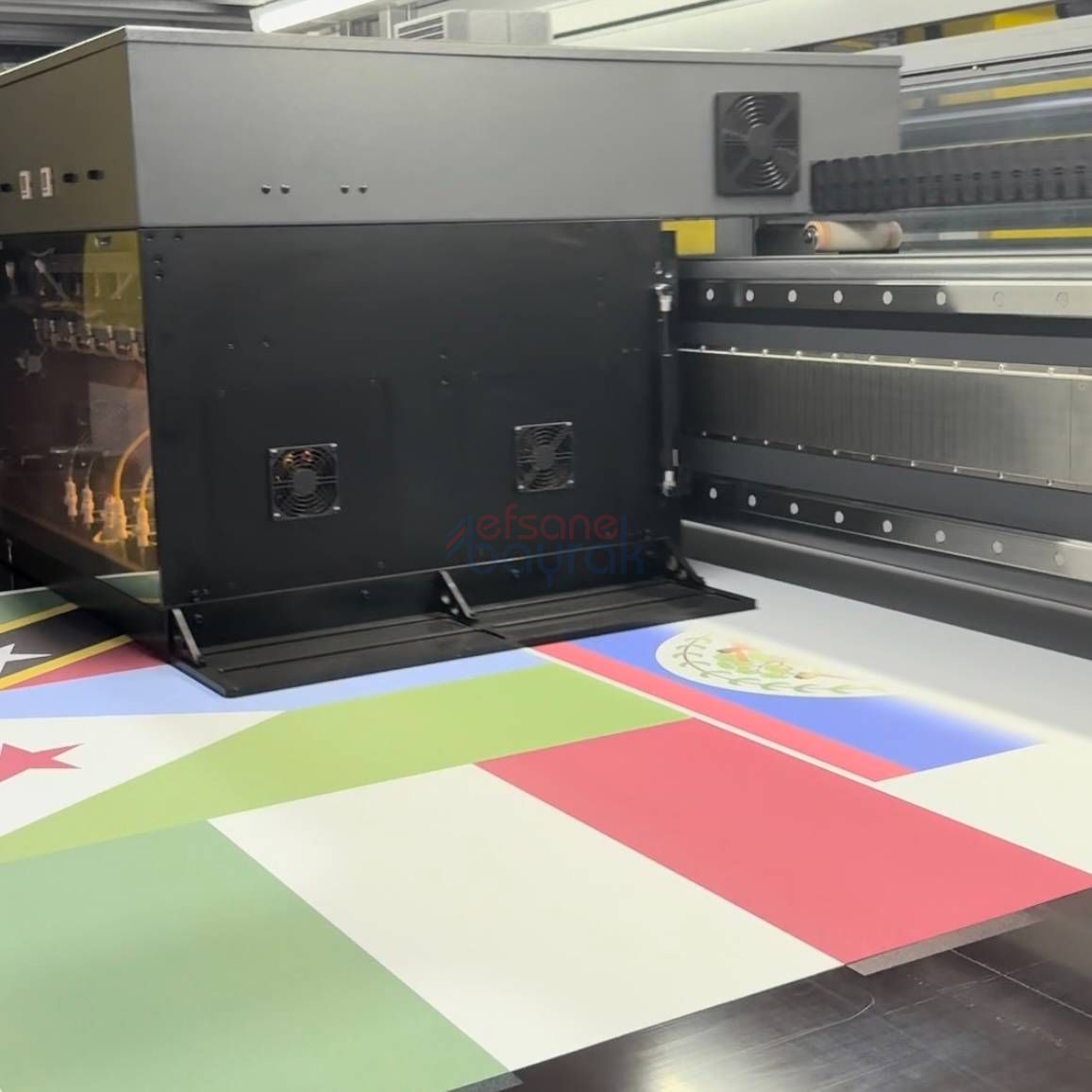 Efsane Bayrak, gelişmiş püskürtme dijital baskı sistemleriyle raşel kumaşa özel desen, logo ve grafiklerin 3 metre ene kadar net ve canlı şekilde uygulanmasını sağlar. Saatte 1800 metre üretim kapasitesiyle, kurumsal bayrak üretiminden özel tasarımlara kadar tüm siparişlerde hızlı çözüm sunar.